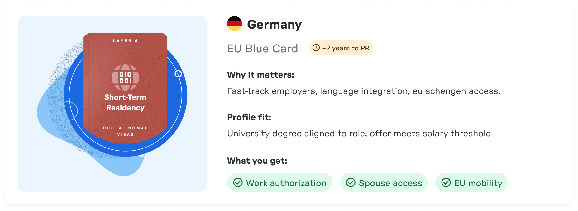 - Advisory access: Book vetted attorneys and relocation partners for each route from the Marketplace.
